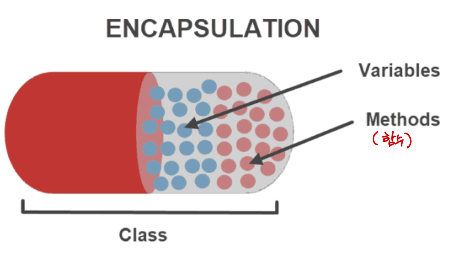( 캡슐화는 public, private 상관없이 핵심만 보게 하는 것 ) - 모듈 내부에 자료를 감추어서 다른 모듈에서 접근하거나 변경하지 못하도록 막는 것