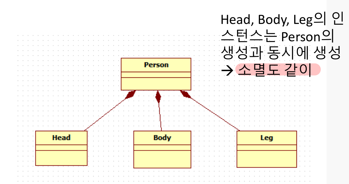 -> 전체 객체가 사라지면 부분 객체도 사라짐 (내부 정의로 구현)