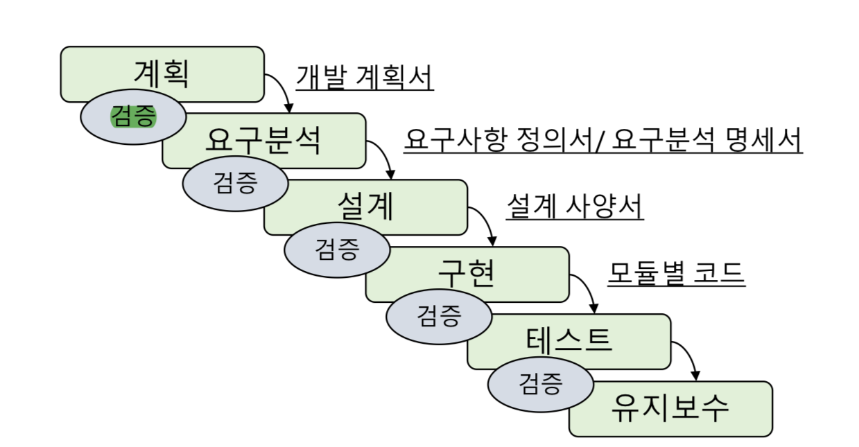 - '계획 -> 요구 분석 -> 설계 -> 구현 -> 테스트 -> 유지보수' 순서로 진행