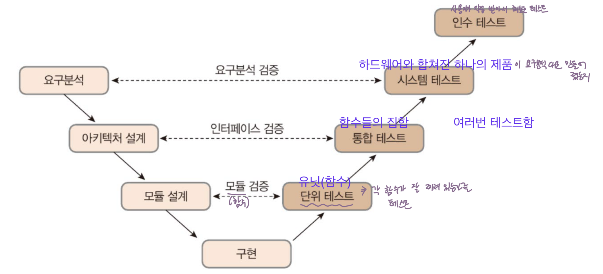 - 테스트 단계를 추가한 폭포수 모델의 변형 (테스트 단계가 여러 stage로 나누어져 있음)