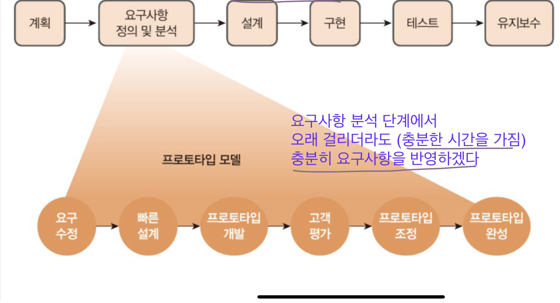 폭포수 모델은 완성된 요구사항을 바탕으로 설계 이후 바로 구현에 들어감 (프로토타입 없음)