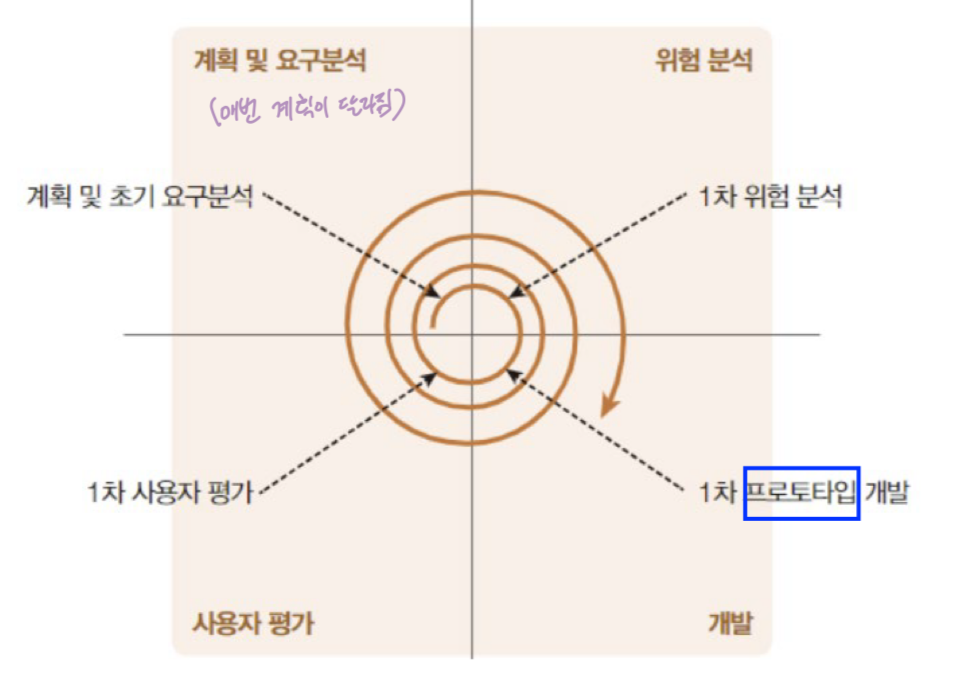 - 추가로 프로토타입에 위험분석단계(우리가 이 요구를 정말 반영해야 하는가?)까지 추가 가능 (나선형 모델)